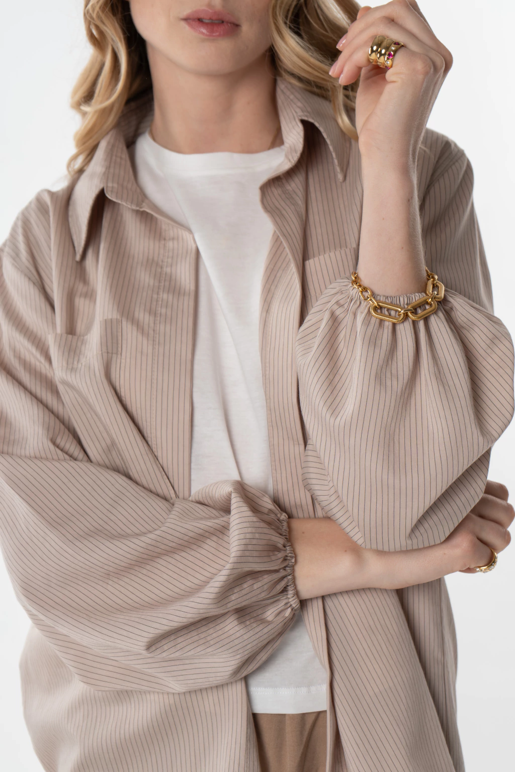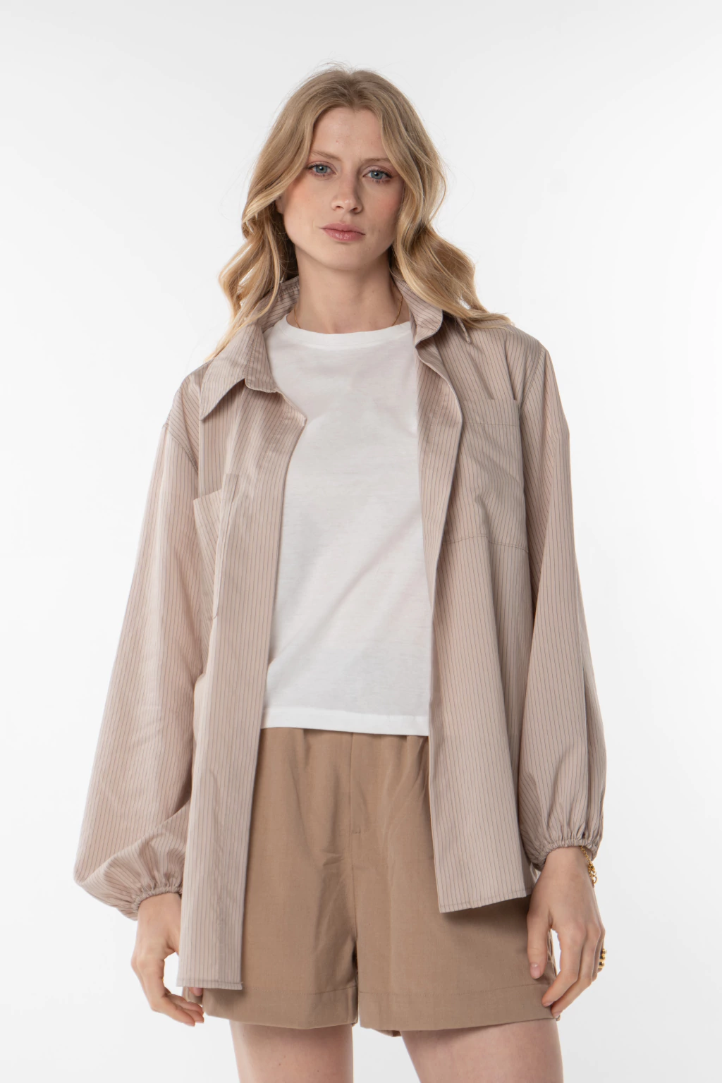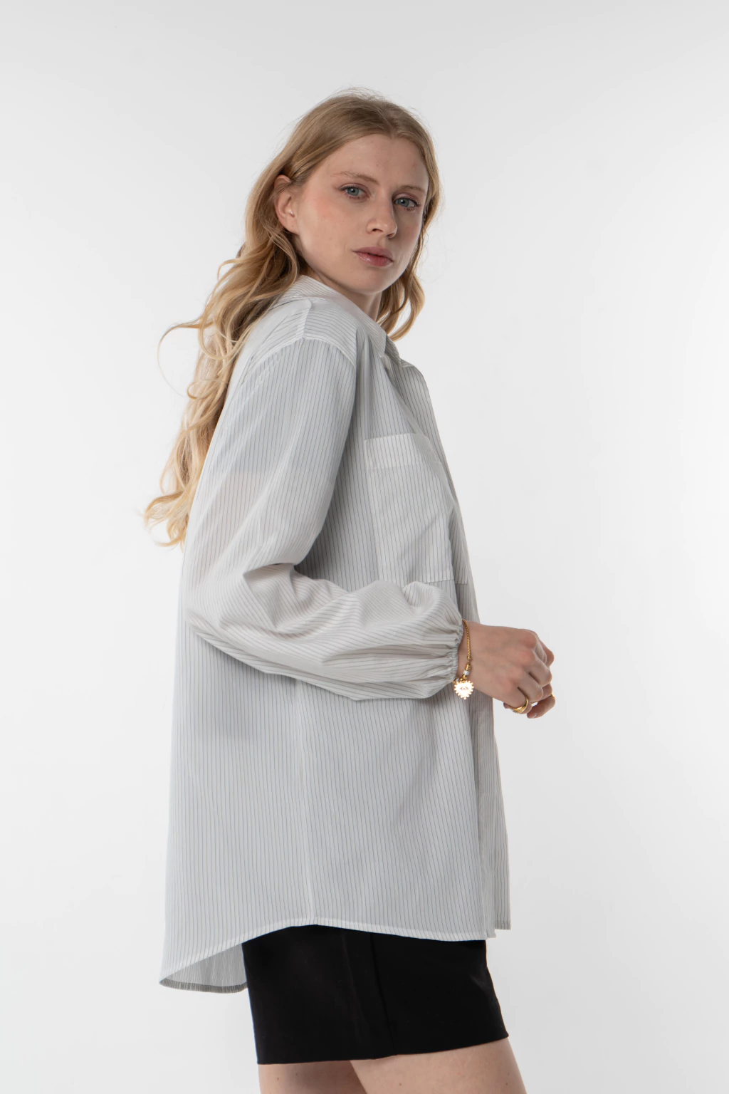 Camisa oversize con un diseño relajado y femenino. Con mangas globo con elástico, bolsillo frontal y botones duvian a tono, esta prenda se distingue por su calce amplio y cómodo