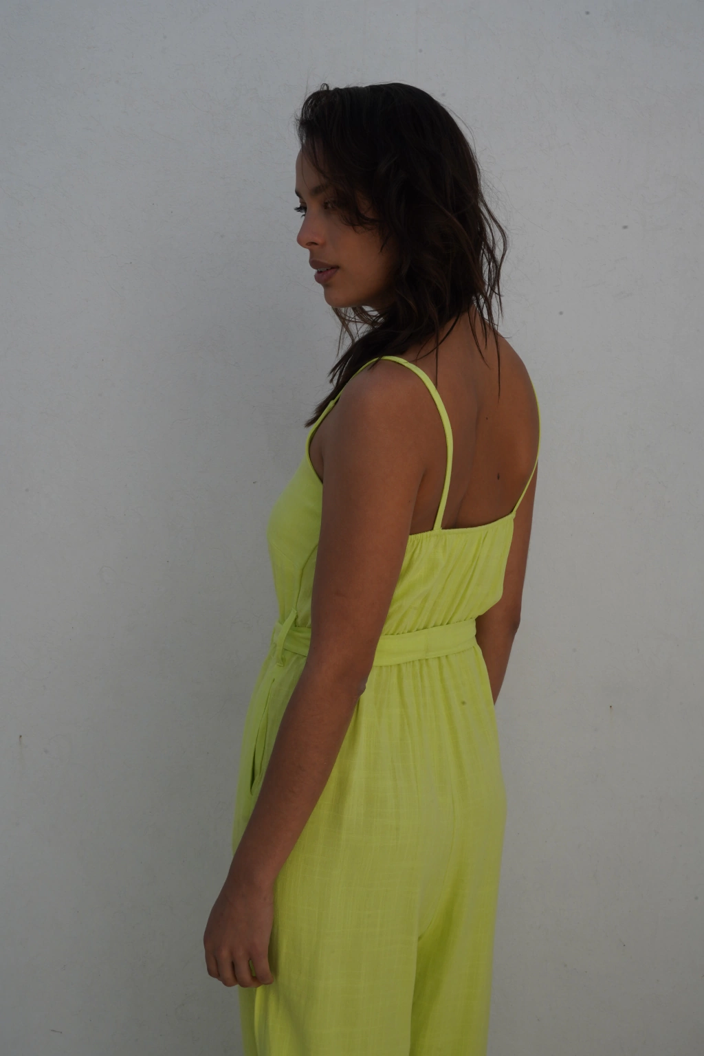 Enterito confeccionado en Lino, con elastico en la cintura para generar fruncido, lleva lazo en la cintura removible