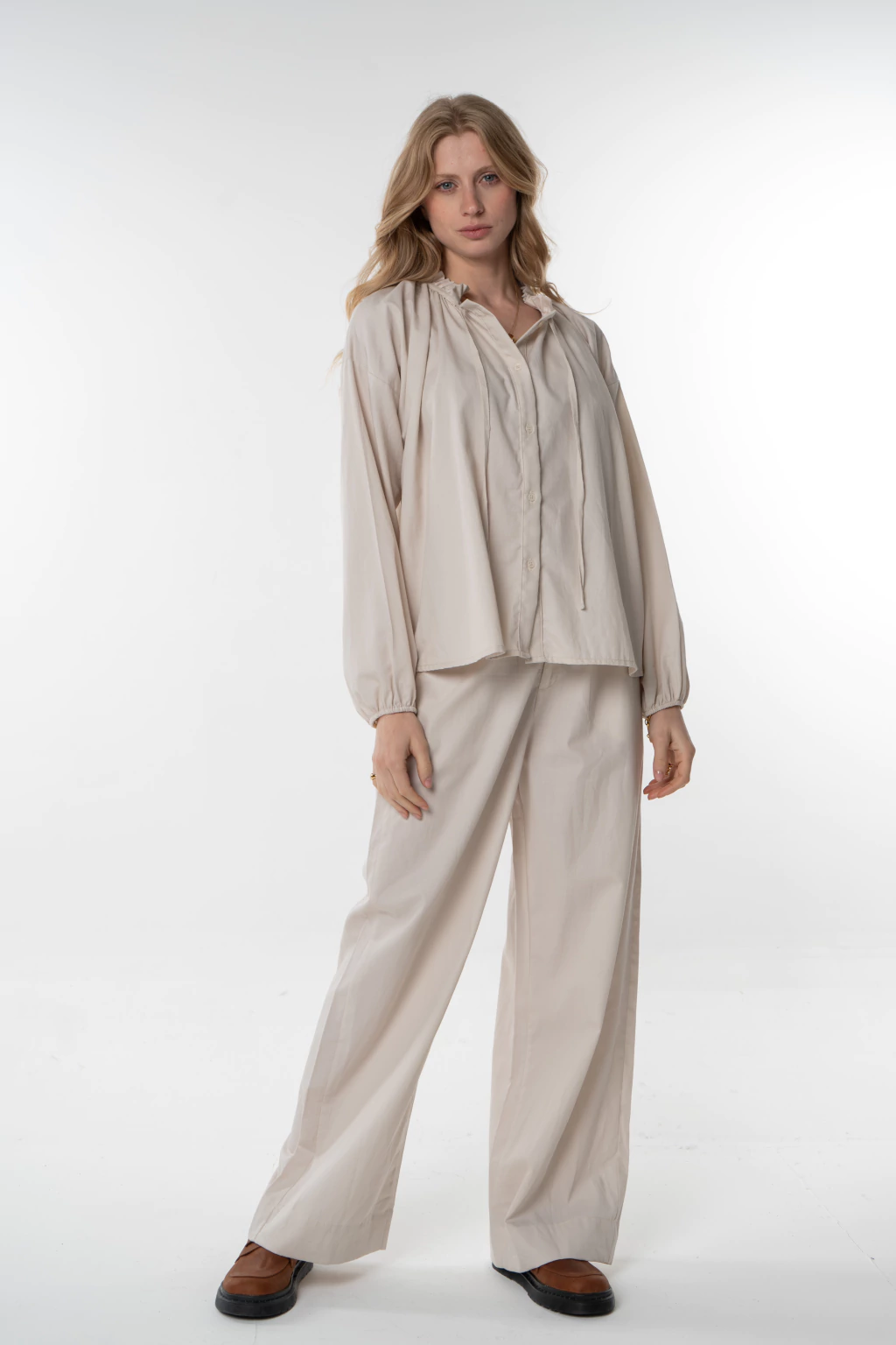 Pantalon sastrero confeccionado en Poplin demin con pinzas en el delantero y elasticon en la parte de atras de la cintura