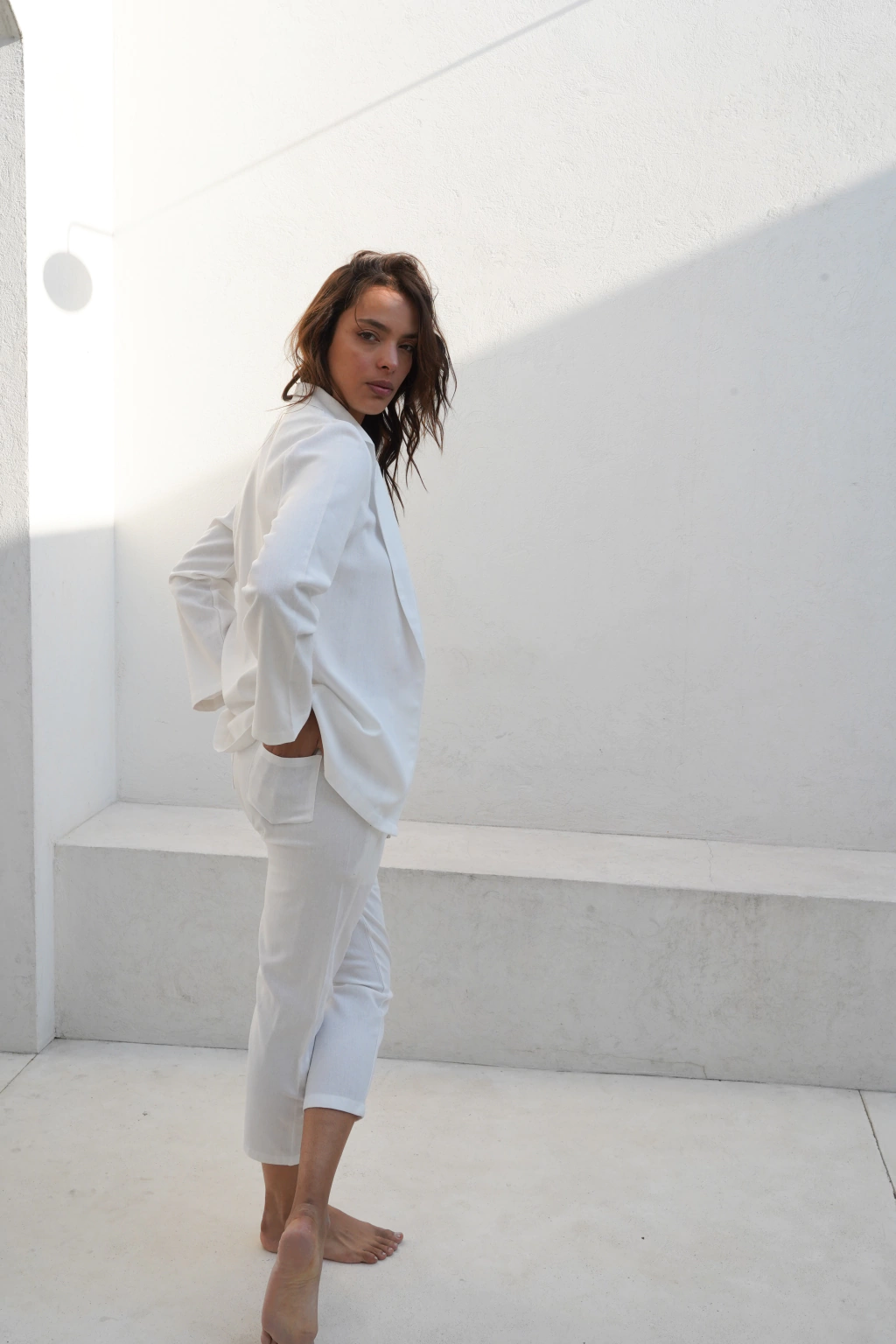 Pantalon confeccionado en Lino, lleva cintura con elastico y cordon de cinta hilera mercerizada,con punteras metalicas y bolsillos en los costados y en el trasero