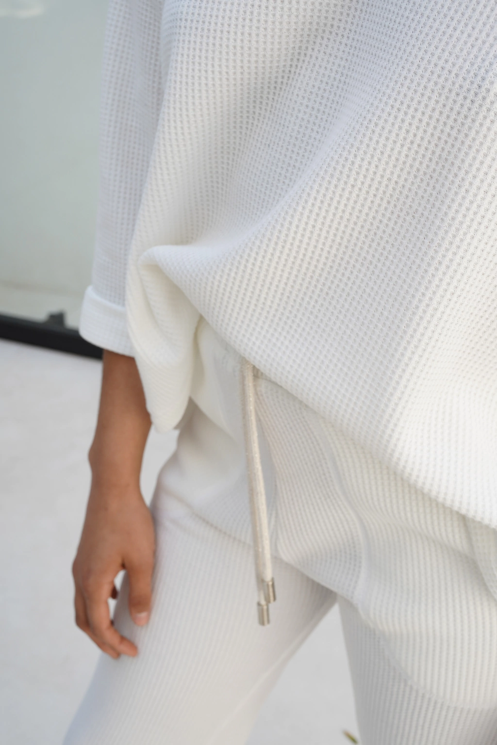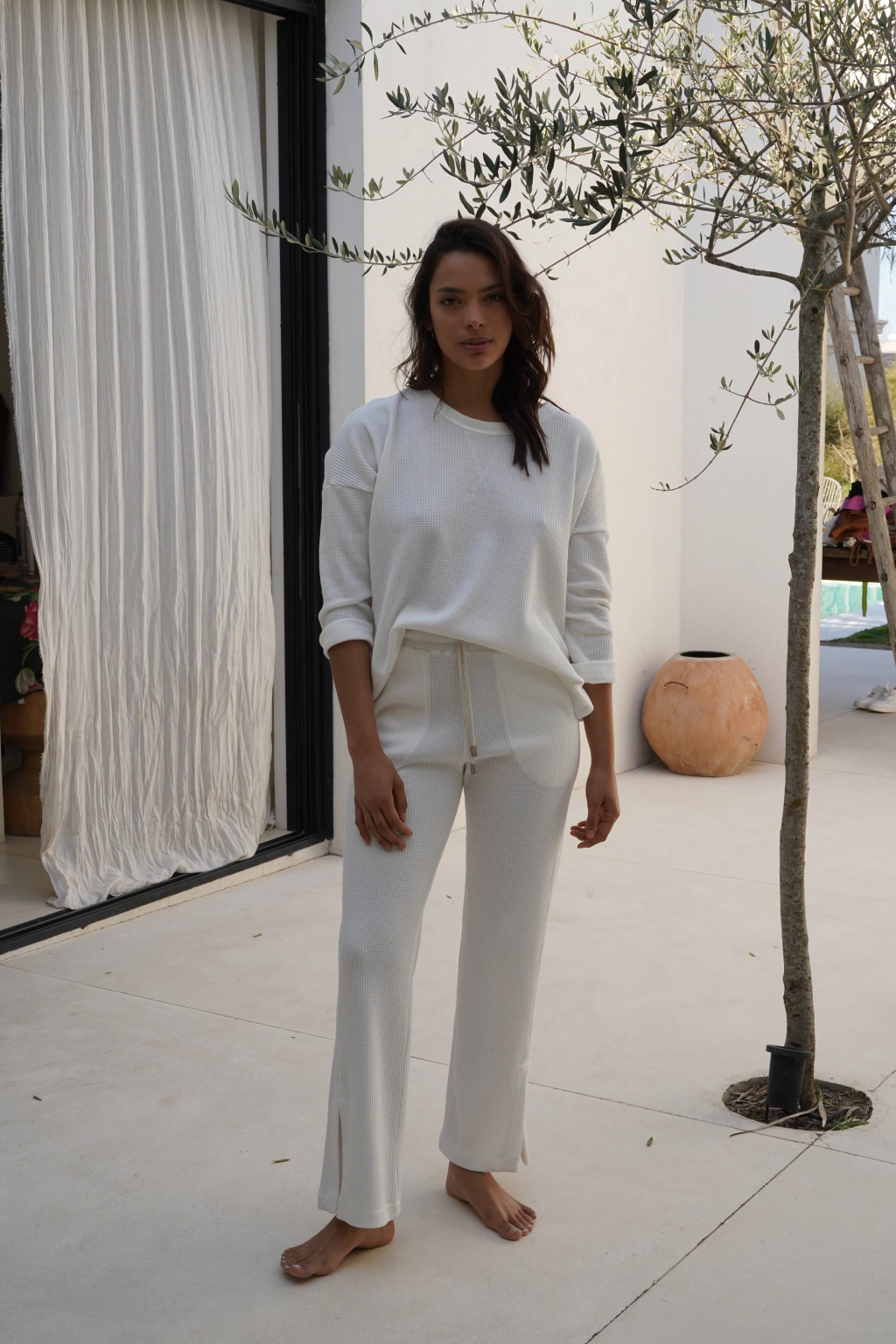 Pantalon confeccionado en Waffle, con bolsillos en los costados y tajos en la botamanga, lleva cordon con brillitos