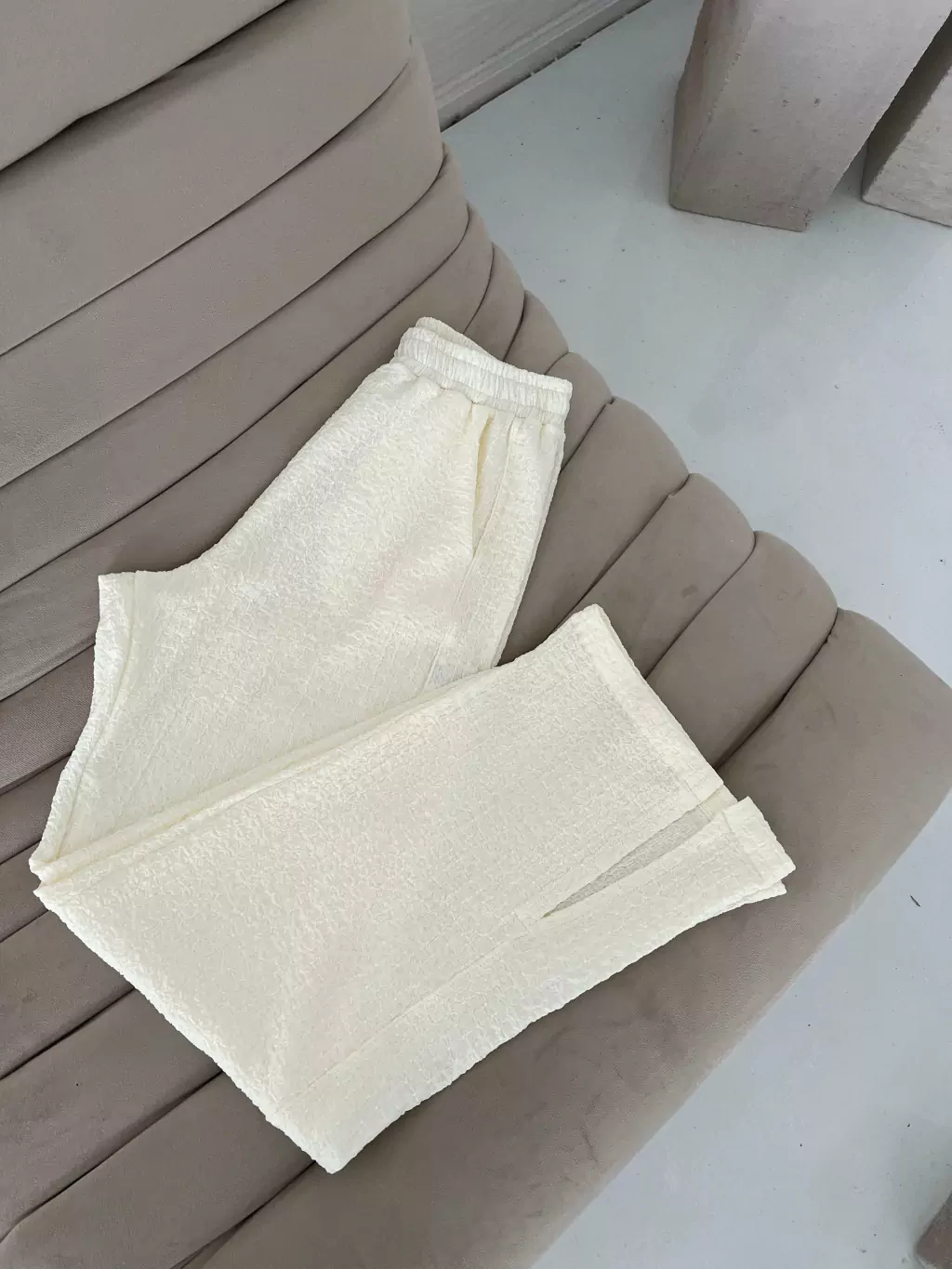Pantalon confeccionado en Viscosa Texturizada, con elastico en cintura y bolsillos en los costados y lleva tajos en la botamanga.