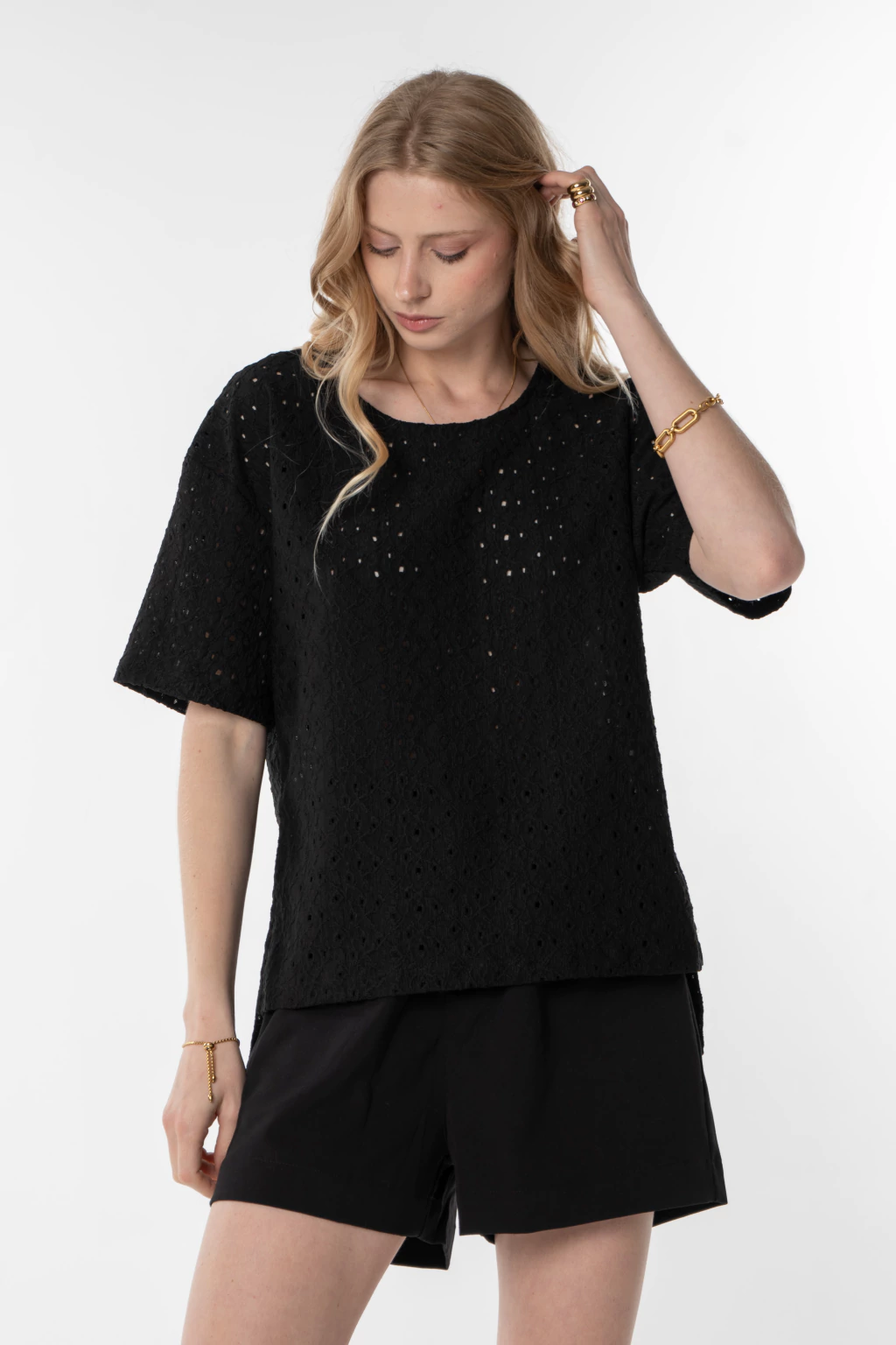 Confeccionado en un broderie depunto calado, aporta textura,liviandad y un toque sutil detransparencia.
