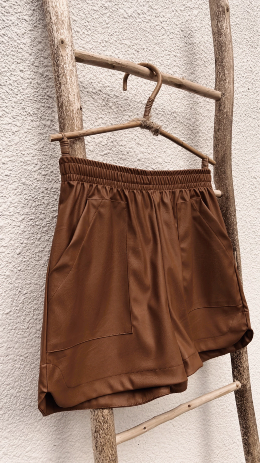 Short confeccionado en cuerina, con bolsillos cuadrados en el delantero y elastico en la cintura