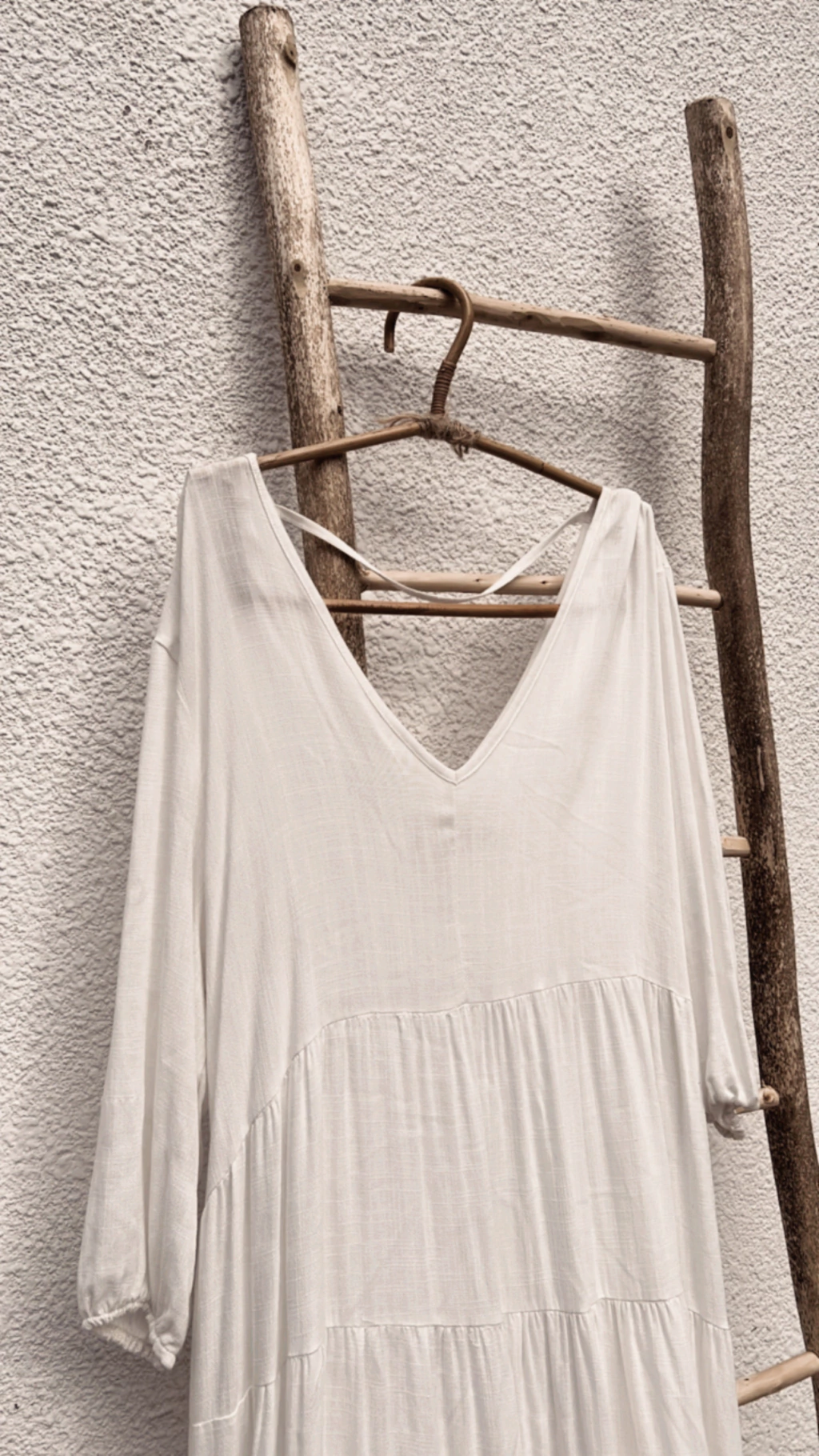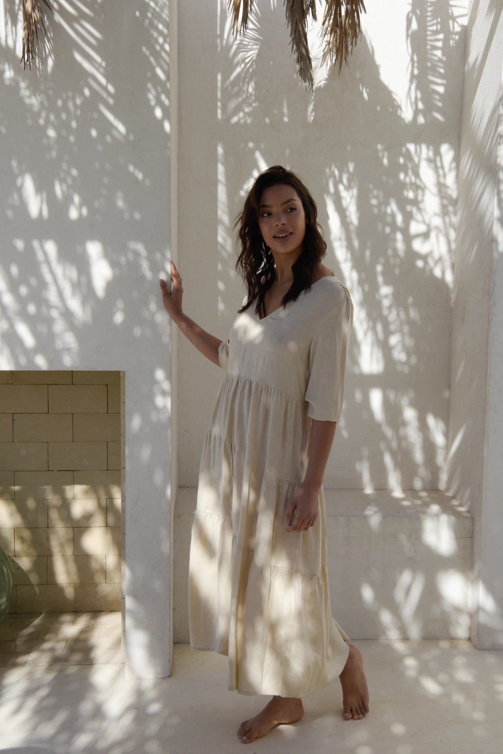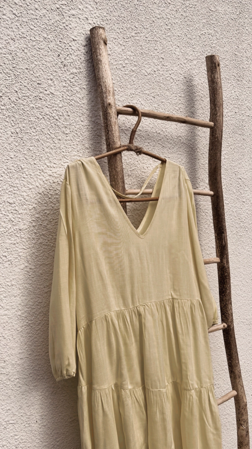 Vestido largo confeccionado en Rayon Simil Lino, con frunces y escote en V en delantero y espalda