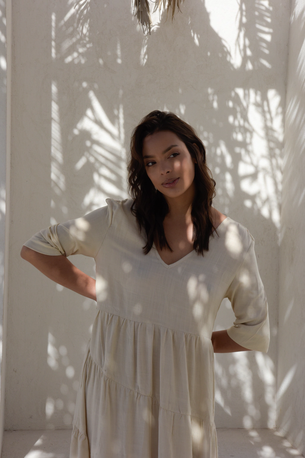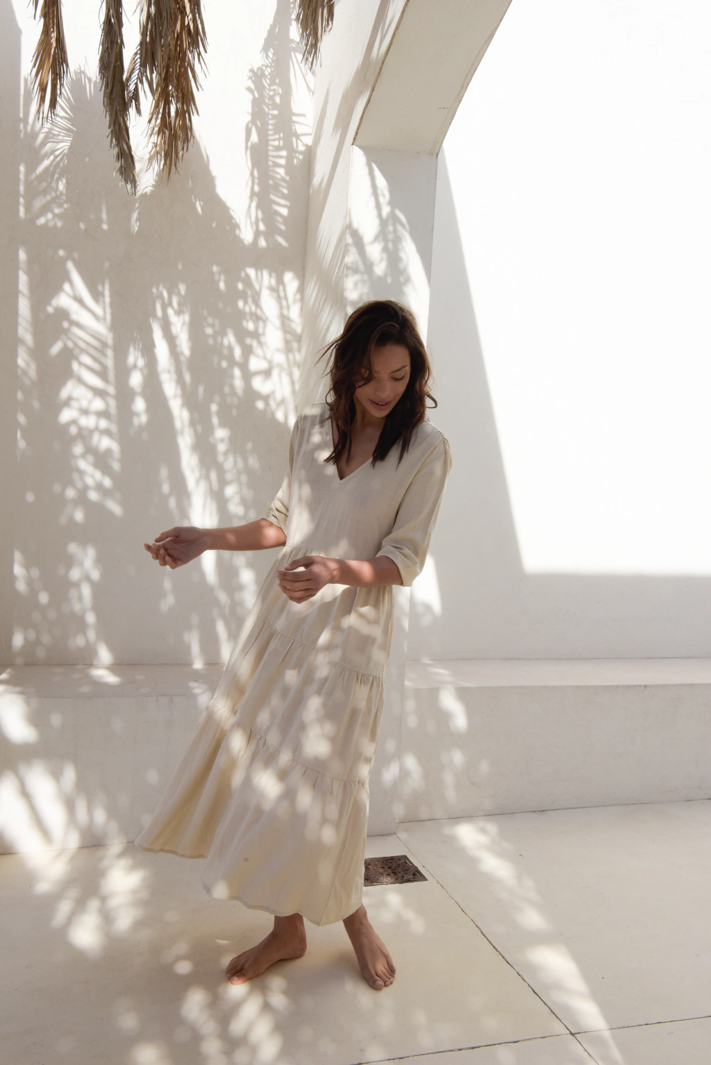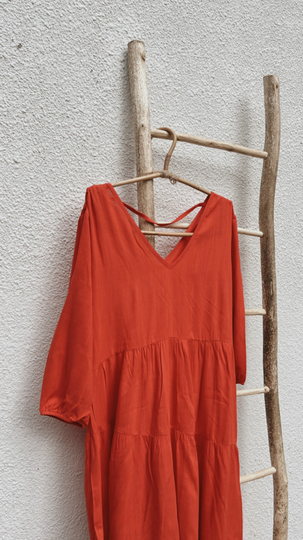 Vestido largo confeccionado en Rayon Simil Lino, con frunces y escote en V en delantero y espalda