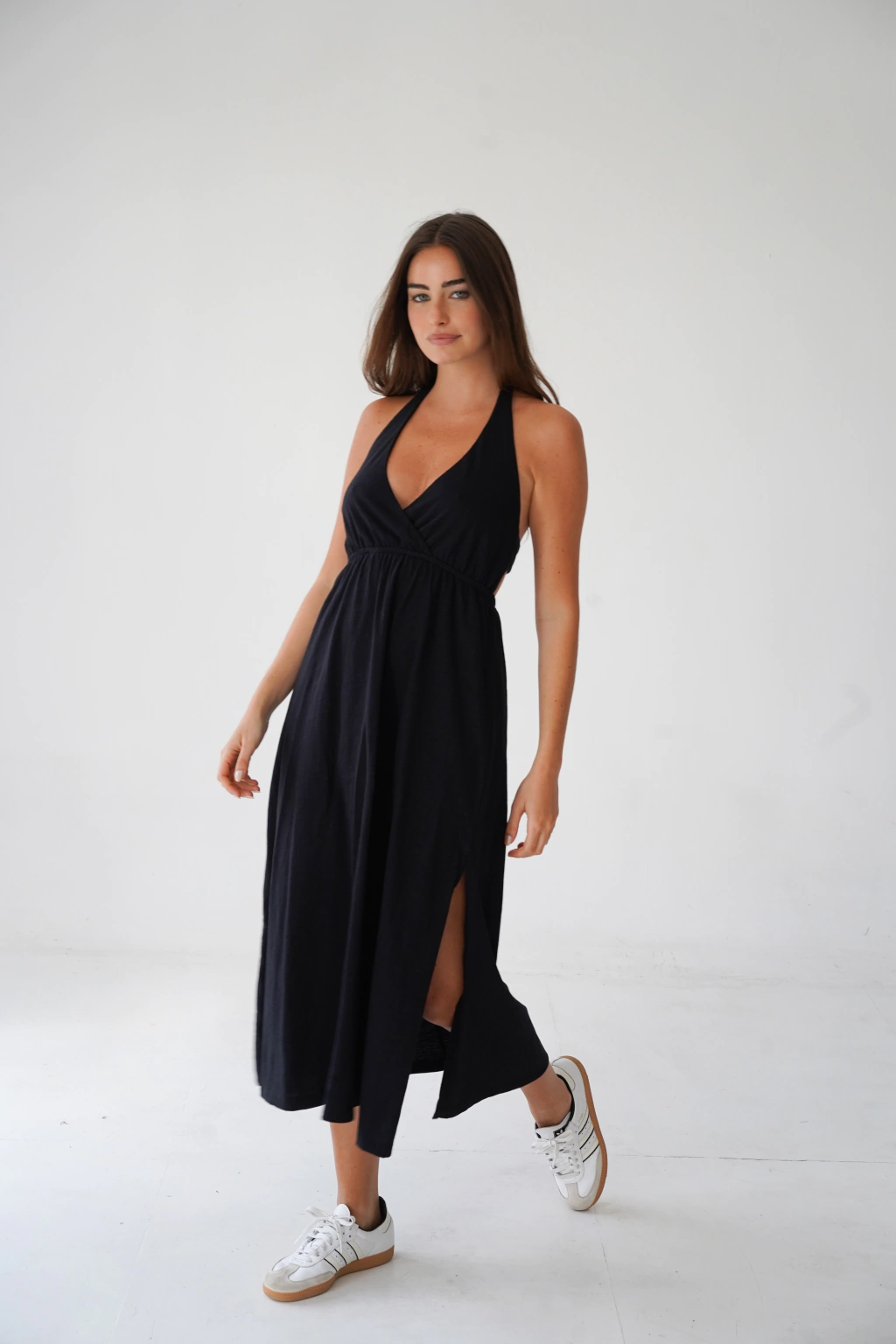 Vestido confeccionado en algodón Flame Pima. Con espalda descubierta y atadura en el cuello y espalda.